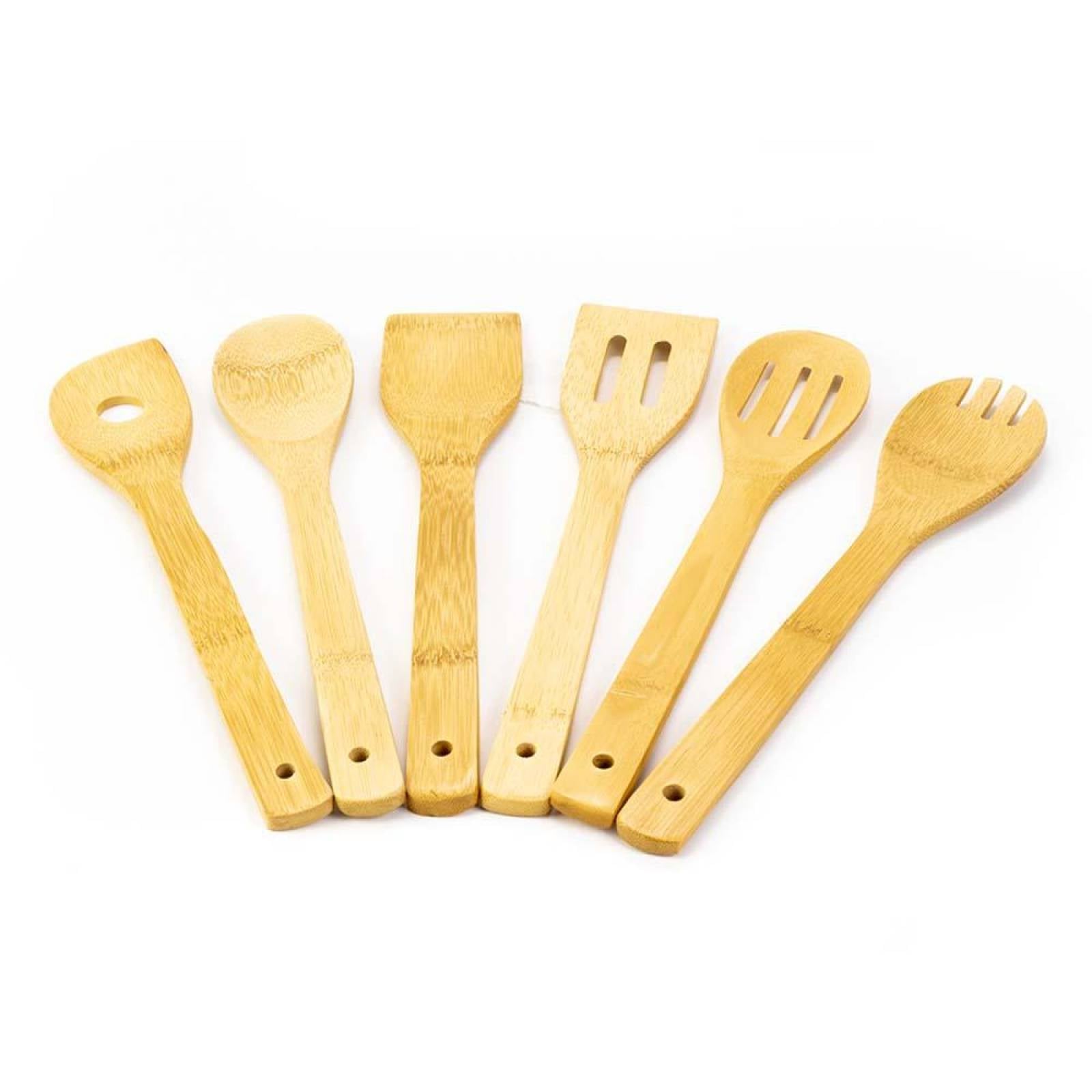 Set de 6 utensilios de cocina. Incluye: 1 tenedor, 1 cuchara, 1 cuchara ranurada, 1 pala ranurada, 1 pala, 1 espátula para salsas. Fabricados en bambú natural. Estos utensilios de cocina son ideales para cocinar en cacerolas o sartenes con recubrimiento de cerámica o teflón..